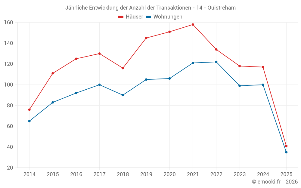 Der Durchschnittspreis auf den 35 Wohnungstransaktionen der letzten 6 Monate in der Gemeinde Ouistreham betrug 3 625 € pro Quadratmeter für einen mittleren Immobilienwert von 126 000 €. Über diesen Zeitraum hinweg lagen 60% der Transaktionen zwischen 2 723 und 4 216 € pro Quadratmeter (vom 2. bis zum 8. Dezil).
