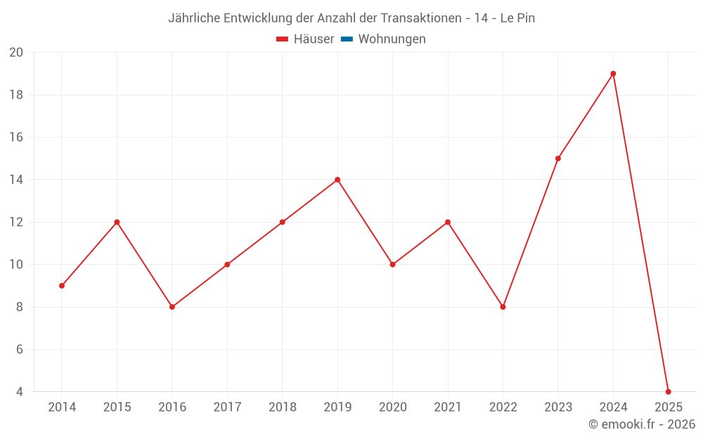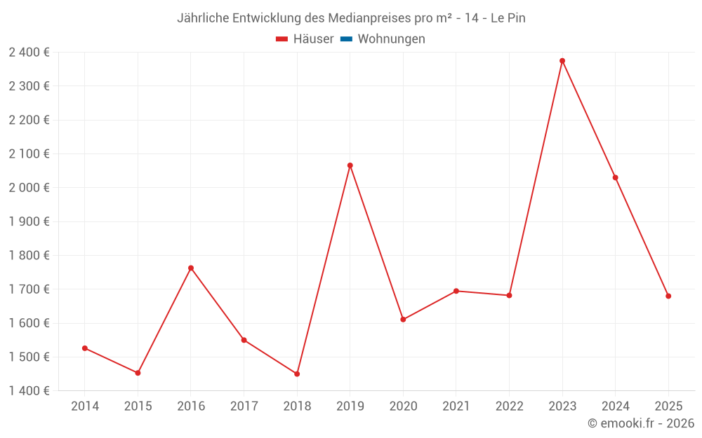 Der Durchschnittspreis auf den 33 Hausgeschäften der letzten 24 Monate in der Gemeinde Le Pin betrug 2 030 € pro Quadratmeter für einen mittleren Immobilienwert von 232 000 €. Über diesen Zeitraum hinweg lagen 60% der Transaktionen zwischen 1 679 und 2 711 € pro Quadratmeter (vom 2. bis zum 8. Dezil).