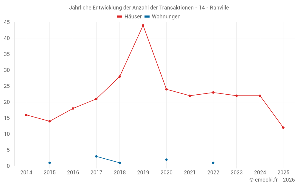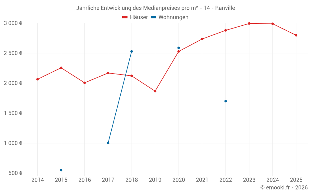 Der Durchschnittspreis auf den 25 Hausgeschäften der letzten 12 Monate in der Gemeinde Ranville betrug 2 736 € pro Quadratmeter für einen mittleren Immobilienwert von 281 400 €. Über diesen Zeitraum hinweg lagen 60% der Transaktionen zwischen 2 431 und 3 285 € pro Quadratmeter (vom 2. bis zum 8. Dezil).
