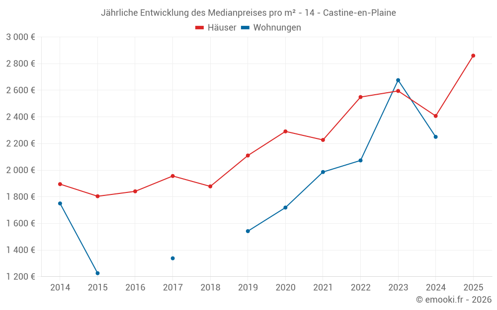 Der Durchschnittspreis auf den 18 Hausgeschäften der letzten 12 Monate in der Gemeinde Castine-en-Plaine betrug 2 688 € pro Quadratmeter für einen mittleren Immobilienwert von 294 860 €. Über diesen Zeitraum hinweg lagen 60% der Transaktionen zwischen 1 945 und 3 032 € pro Quadratmeter (vom 2. bis zum 8. Dezil).