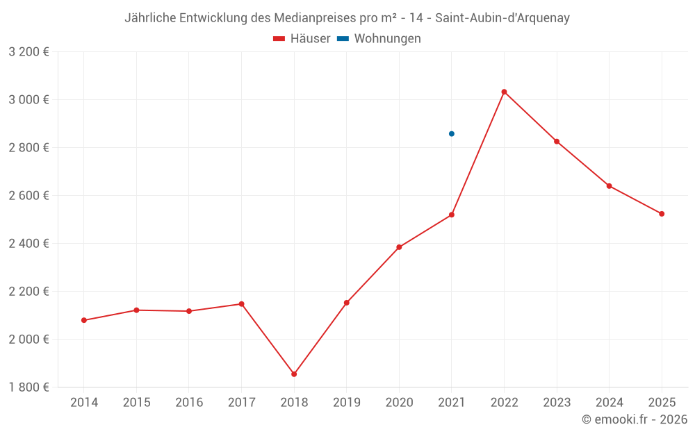 Der Durchschnittspreis auf den 35 Hausgeschäften der letzten 24 Monate in der Gemeinde Saint-Aubin-d'Arquenay betrug 2 760 € pro Quadratmeter für einen mittleren Immobilienwert von 239 730 €. Über diesen Zeitraum hinweg lagen 60% der Transaktionen zwischen 2 262 und 3 106 € pro Quadratmeter (vom 2. bis zum 8. Dezil).