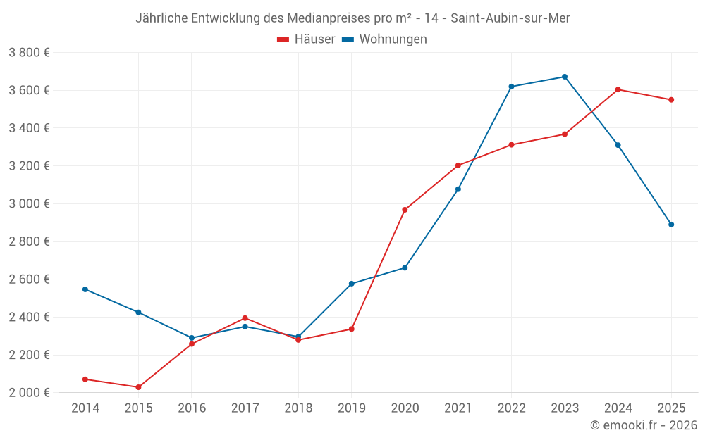 Der Durchschnittspreis auf den 27 Hausgeschäften der letzten 12 Monate in der Gemeinde Saint-Aubin-sur-Mer betrug 3 352 € pro Quadratmeter für einen mittleren Immobilienwert von 274 000 €. Über diesen Zeitraum hinweg lagen 60% der Transaktionen zwischen 2 766 und 4 250 € pro Quadratmeter (vom 2. bis zum 8. Dezil).