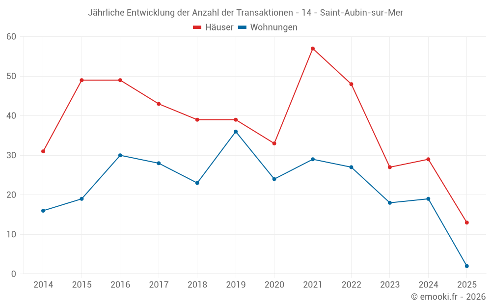 Der Durchschnittspreis auf den 33 Wohnungstransaktionen der letzten 24 Monate in der Gemeinde Saint-Aubin-sur-Mer betrug 3 438 € pro Quadratmeter für einen mittleren Immobilienwert von 126 610 €. Über diesen Zeitraum hinweg lagen 60% der Transaktionen zwischen 2 845 und 4 223 € pro Quadratmeter (vom 2. bis zum 8. Dezil).