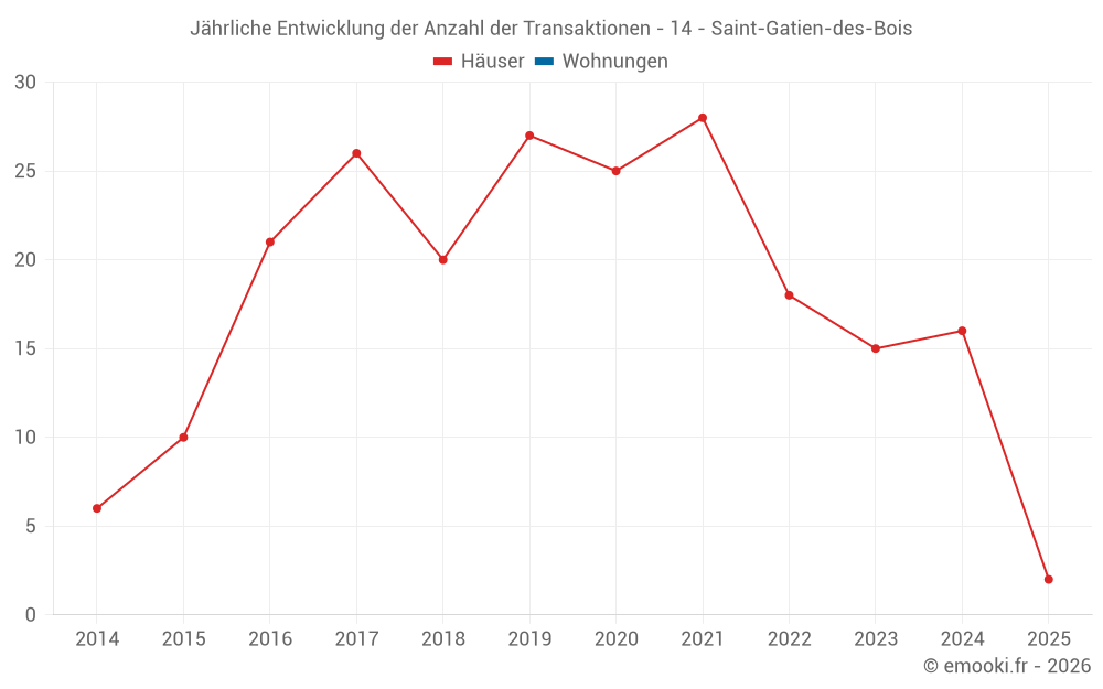 Der Durchschnittspreis auf den 24 Hausgeschäften der letzten 24 Monate in der Gemeinde Saint-Gatien-des-Bois betrug 2 816 € pro Quadratmeter für einen mittleren Immobilienwert von 242 000 €. Über diesen Zeitraum hinweg lagen 60% der Transaktionen zwischen 1 980 und 3 700 € pro Quadratmeter (vom 2. bis zum 8. Dezil).