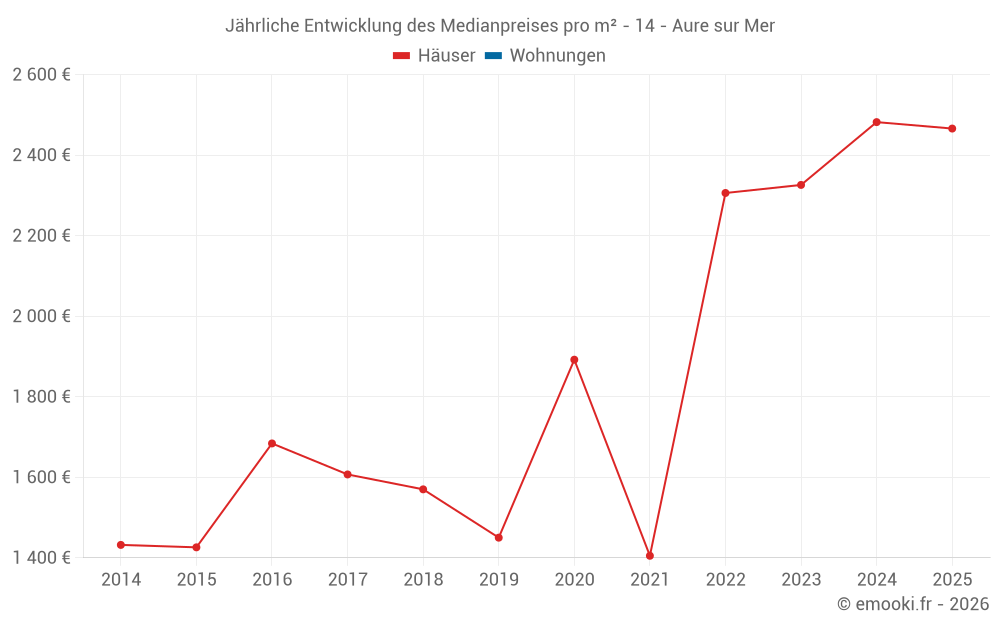 Der Durchschnittspreis auf den 17 Hausgeschäften der letzten 24 Monate in der Gemeinde Aure sur Mer betrug 2 314 € pro Quadratmeter für einen mittleren Immobilienwert von 236 050 €. Über diesen Zeitraum hinweg lagen 60% der Transaktionen zwischen 1 432 und 2 735 € pro Quadratmeter (vom 2. bis zum 8. Dezil).