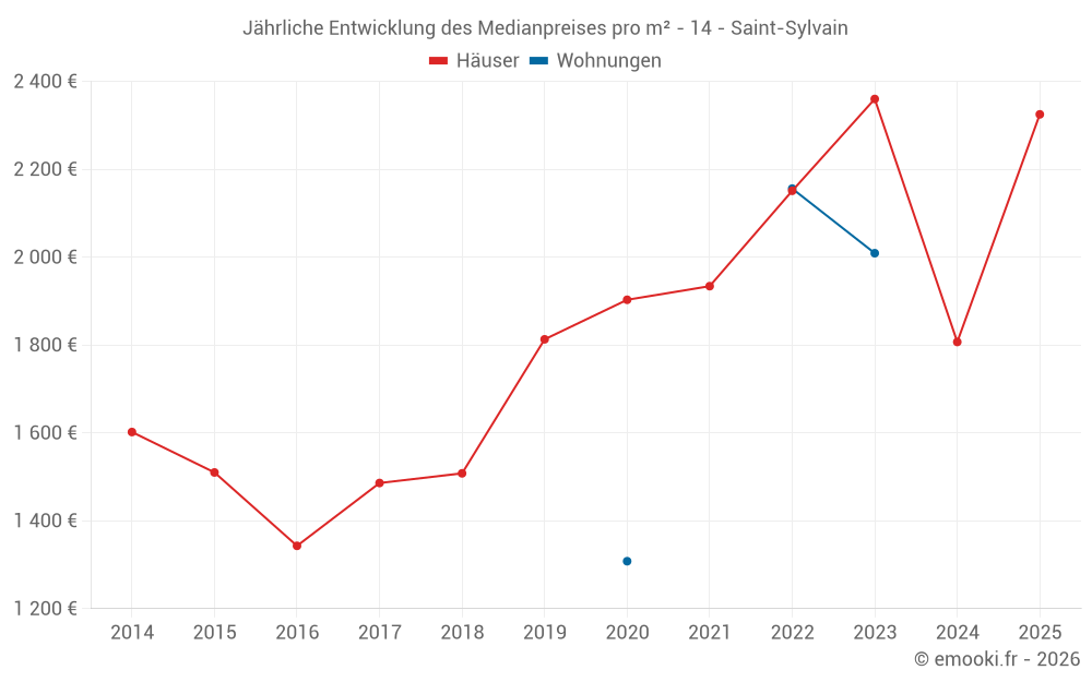 Der Durchschnittspreis auf den 28 Hausgeschäften der letzten 24 Monate in der Gemeinde Saint-Sylvain betrug 2 247 € pro Quadratmeter für einen mittleren Immobilienwert von 197 450 €. Über diesen Zeitraum hinweg lagen 60% der Transaktionen zwischen 1 699 und 2 548 € pro Quadratmeter (vom 2. bis zum 8. Dezil).