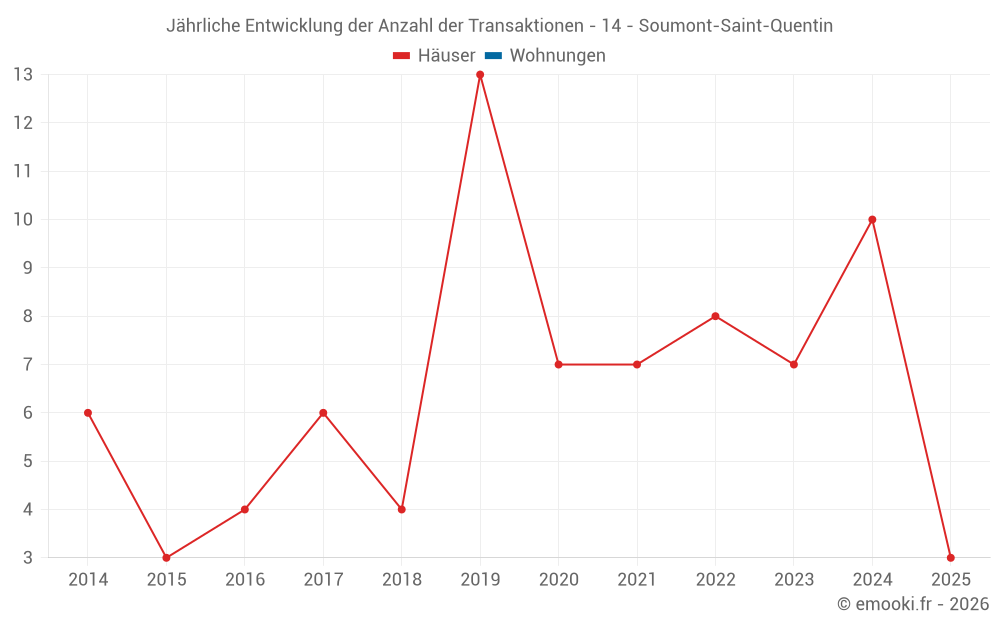 Der Durchschnittspreis auf den 15 Hausgeschäften der letzten 24 Monate in der Gemeinde Soumont-Saint-Quentin betrug 1 655 € pro Quadratmeter für einen mittleren Immobilienwert von 160 000 €. Über diesen Zeitraum hinweg lagen 60% der Transaktionen zwischen 508 und 2 174 € pro Quadratmeter (vom 2. bis zum 8. Dezil).