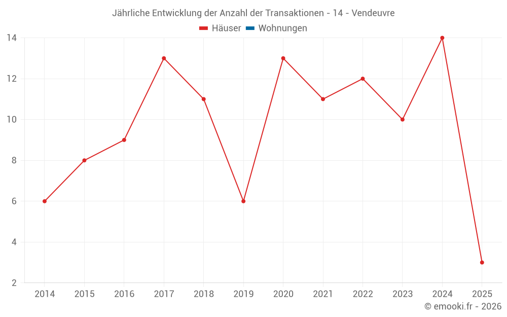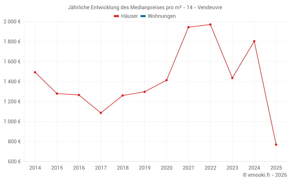 Der Durchschnittspreis auf den 23 Hausgeschäften der letzten 24 Monate in der Gemeinde Vendeuvre betrug 1 560 € pro Quadratmeter für einen mittleren Immobilienwert von 153 785 €. Über diesen Zeitraum hinweg lagen 60% der Transaktionen zwischen 807 und 2 146 € pro Quadratmeter (vom 2. bis zum 8. Dezil).