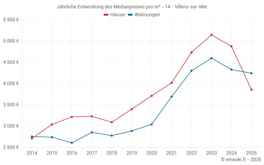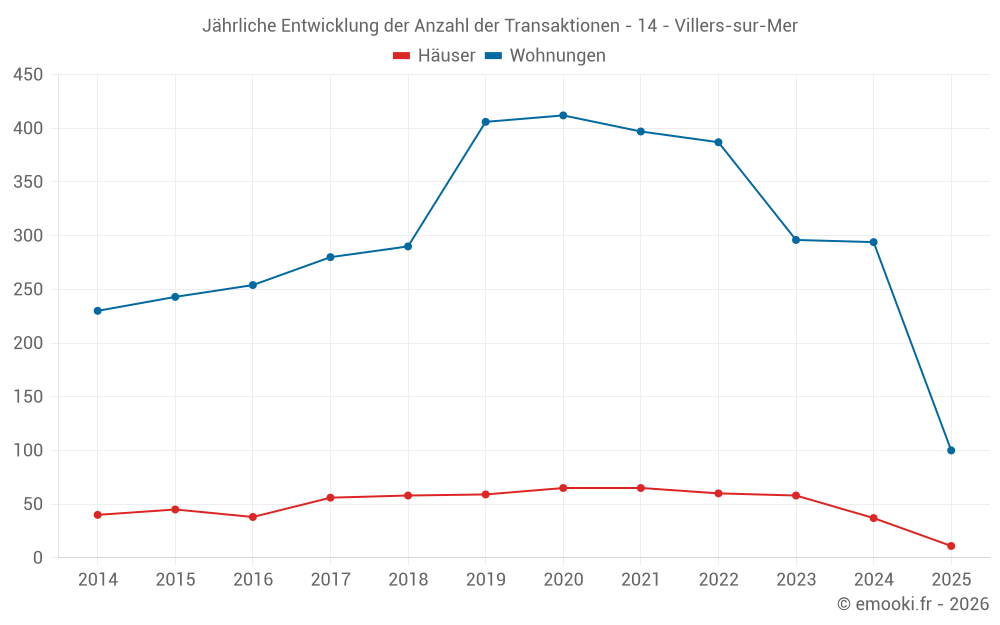 Der Durchschnittspreis auf den 33 Hausgeschäften der letzten 12 Monate in der Gemeinde Villers-sur-Mer betrug 4 875 € pro Quadratmeter für einen mittleren Immobilienwert von 348 500 €. Über diesen Zeitraum hinweg lagen 60% der Transaktionen zwischen 3 617 und 5 922 € pro Quadratmeter (vom 2. bis zum 8. Dezil).