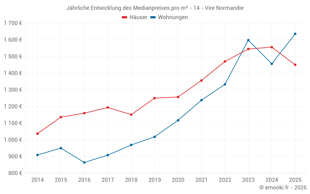 Der Durchschnittspreis auf den 47 Wohnungstransaktionen der letzten 12 Monate in der Gemeinde Vire Normandie betrug 1 606 € pro Quadratmeter für einen mittleren Immobilienwert von 94 320 €. Über diesen Zeitraum hinweg lagen 60% der Transaktionen zwischen 1 258 und 1 912 € pro Quadratmeter (vom 2. bis zum 8. Dezil).