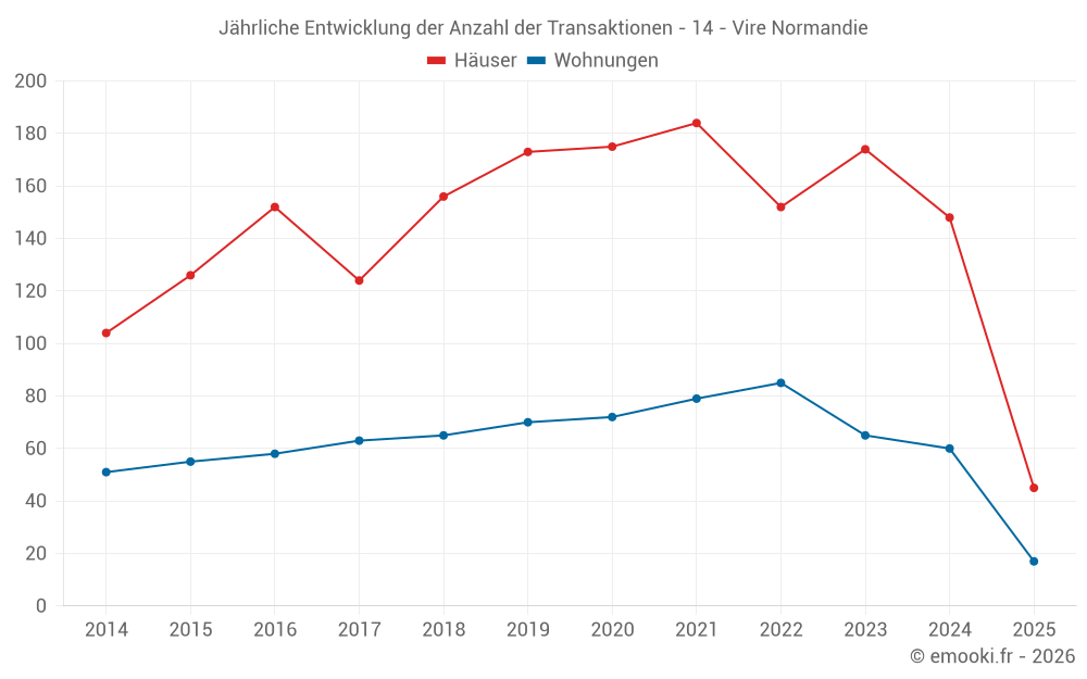 Der Durchschnittspreis auf den 21 Hausgeschäften der letzten 3 Monate in der Gemeinde Vire Normandie betrug 1 432 € pro Quadratmeter für einen mittleren Immobilienwert von 128 990 €. Über diesen Zeitraum hinweg lagen 60% der Transaktionen zwischen 707 und 1 768 € pro Quadratmeter (vom 2. bis zum 8. Dezil).