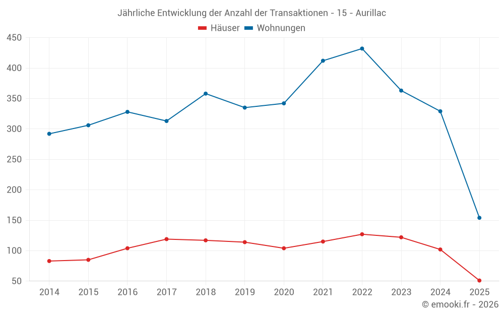Der Durchschnittspreis auf den 22 Hausgeschäften der letzten 3 Monate in der Gemeinde Aurillac betrug 1 740 € pro Quadratmeter für einen mittleren Immobilienwert von 165 050 €. Über diesen Zeitraum hinweg lagen 60% der Transaktionen zwischen 1 375 und 2 189 € pro Quadratmeter (vom 2. bis zum 8. Dezil).
