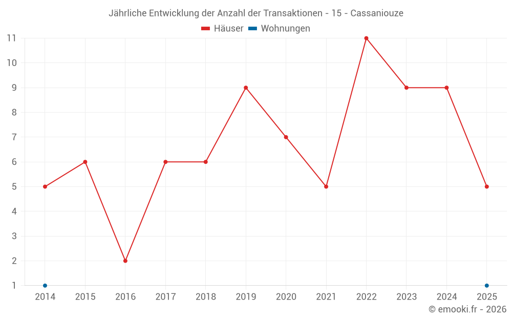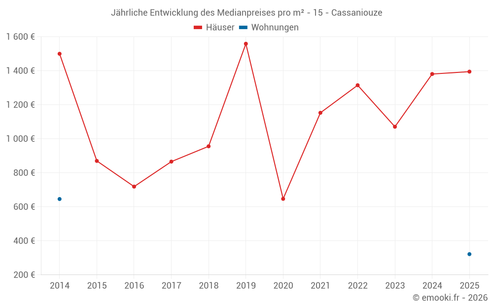 Der Durchschnittspreis auf den 19 Hausgeschäften der letzten 24 Monate in der Gemeinde Cassaniouze betrug 1 192 € pro Quadratmeter für einen mittleren Immobilienwert von 137 800 €. Über diesen Zeitraum hinweg lagen 60% der Transaktionen zwischen 452 und 2 011 € pro Quadratmeter (vom 2. bis zum 8. Dezil).