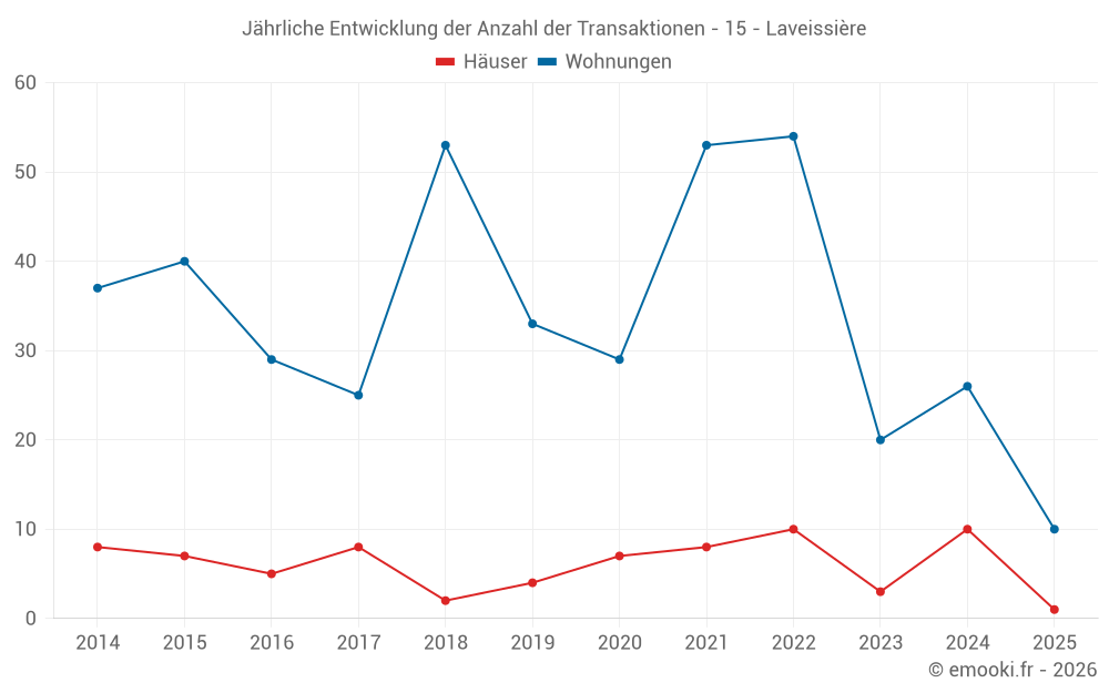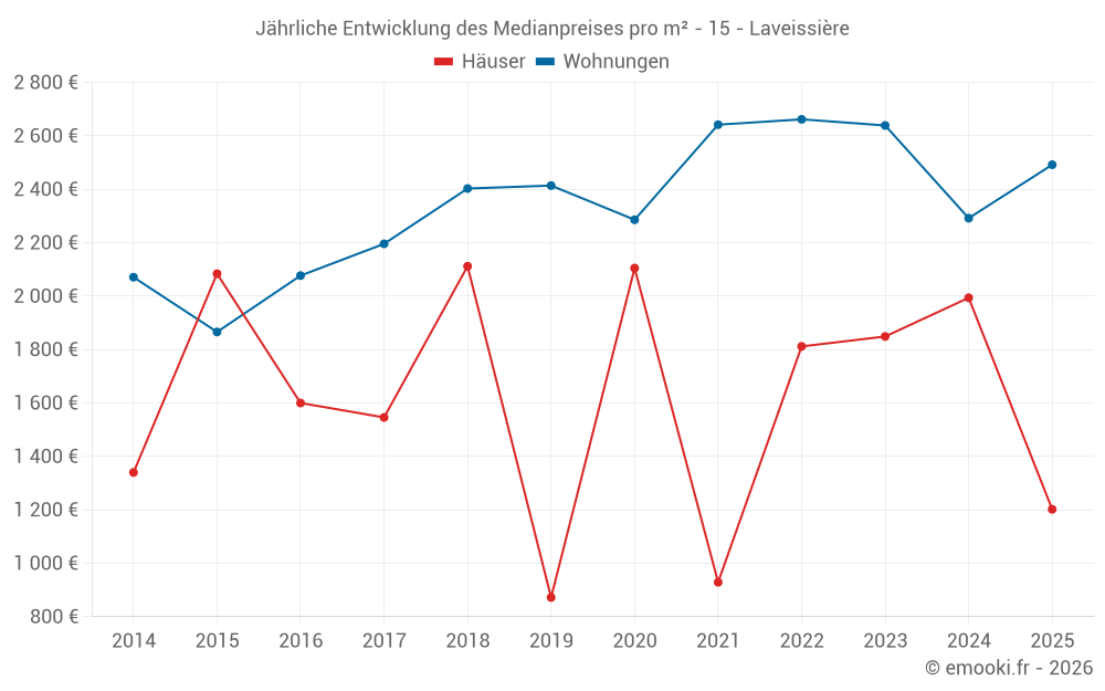 Der Durchschnittspreis auf den 27 Wohnungstransaktionen der letzten 12 Monate in der Gemeinde Laveissière betrug 2 318 € pro Quadratmeter für einen mittleren Immobilienwert von 57 790 €. Über diesen Zeitraum hinweg lagen 60% der Transaktionen zwischen 1 853 und 2 738 € pro Quadratmeter (vom 2. bis zum 8. Dezil).