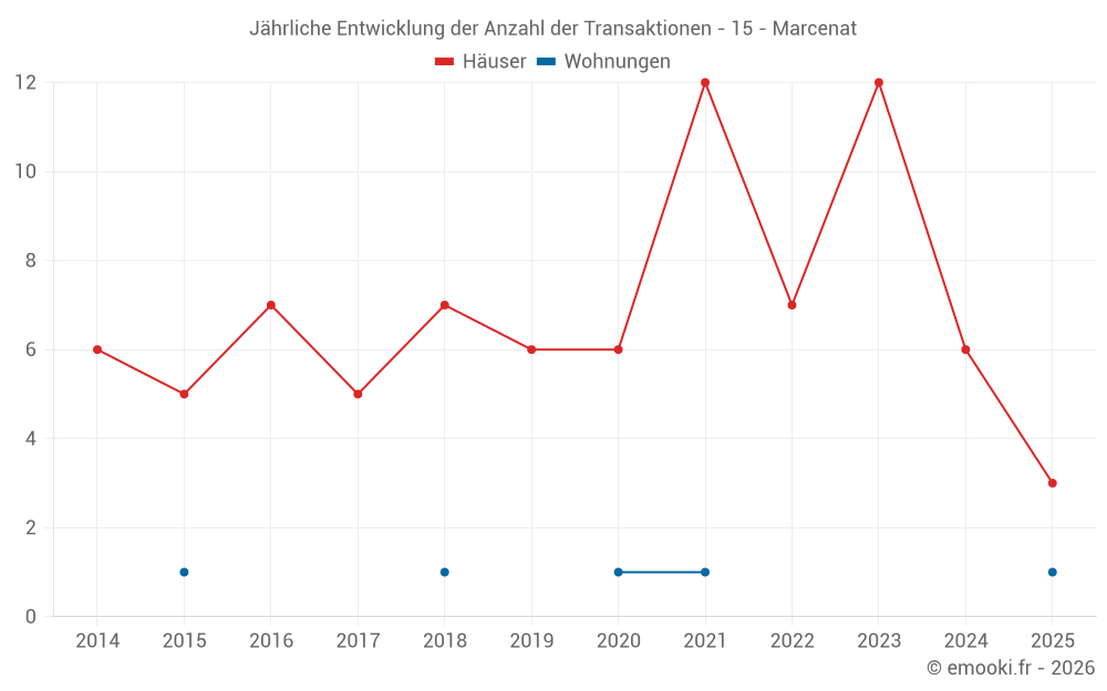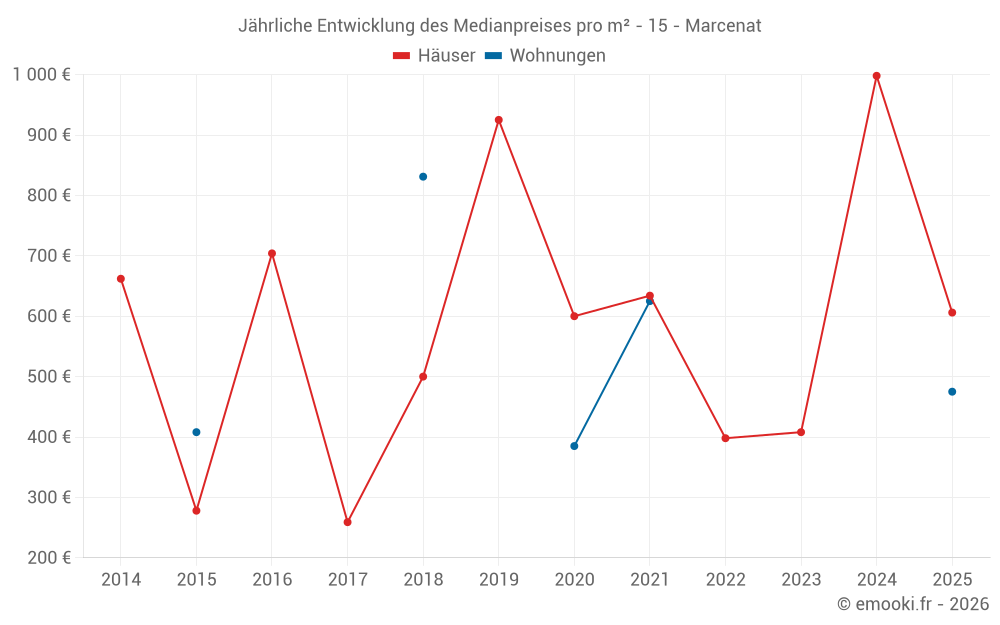 Der Durchschnittspreis auf den 15 Hausgeschäften der letzten 24 Monate in der Gemeinde Marcenat betrug 600 € pro Quadratmeter für einen mittleren Immobilienwert von 48 450 €. Über diesen Zeitraum hinweg lagen 60% der Transaktionen zwischen 236 und 1 258 € pro Quadratmeter (vom 2. bis zum 8. Dezil).