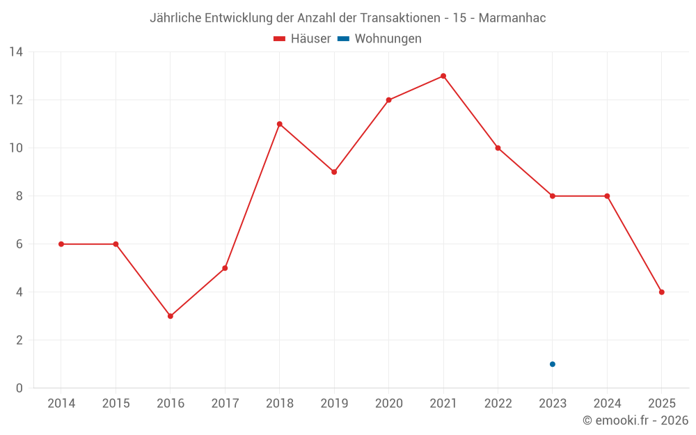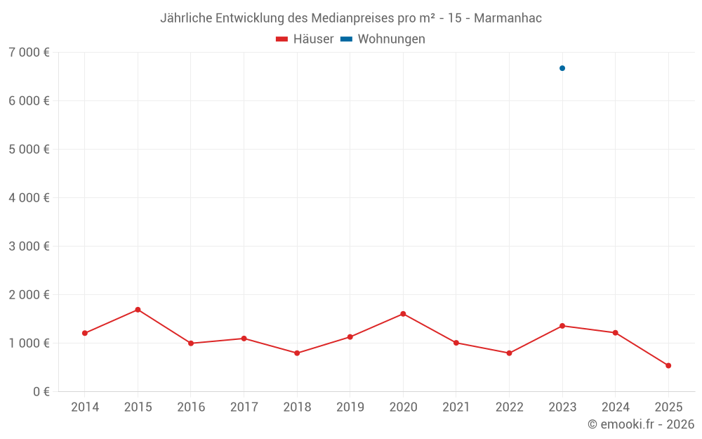 Der Durchschnittspreis auf den 15 Hausgeschäften der letzten 24 Monate in der Gemeinde Marmanhac betrug 1 205 € pro Quadratmeter für einen mittleren Immobilienwert von 110 000 €. Über diesen Zeitraum hinweg lagen 60% der Transaktionen zwischen 423 und 1 442 € pro Quadratmeter (vom 2. bis zum 8. Dezil).