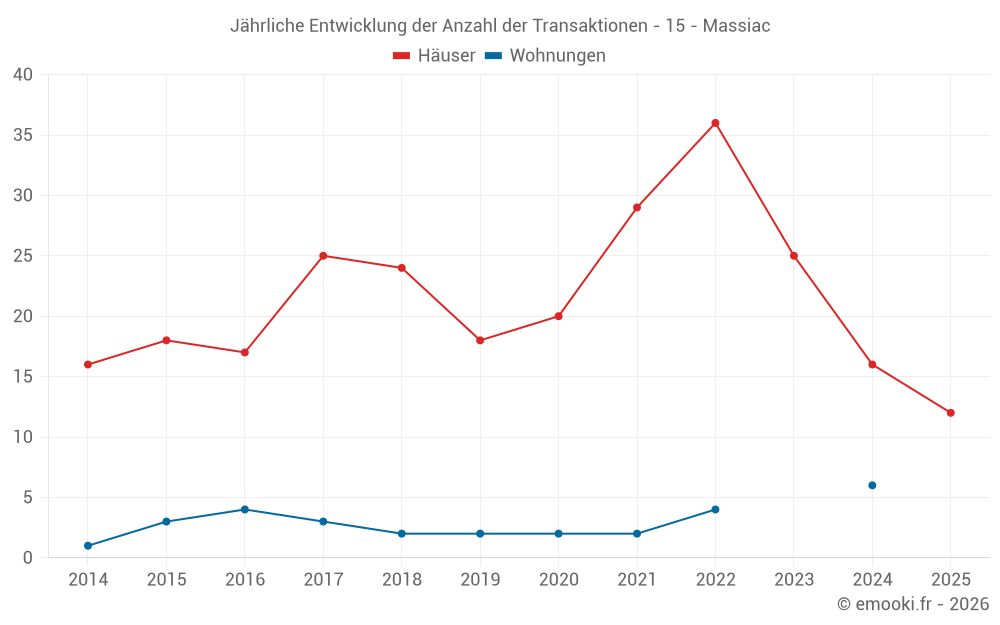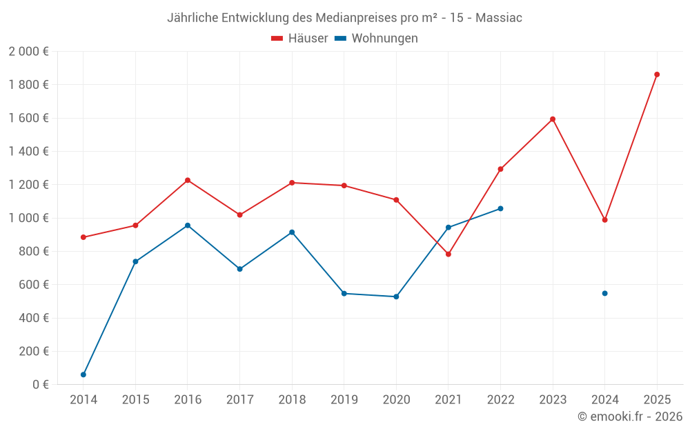 Der Durchschnittspreis auf den 22 Hausgeschäften der letzten 12 Monate in der Gemeinde Massiac betrug 1 234 € pro Quadratmeter für einen mittleren Immobilienwert von 92 625 €. Über diesen Zeitraum hinweg lagen 60% der Transaktionen zwischen 585 und 2 059 € pro Quadratmeter (vom 2. bis zum 8. Dezil).