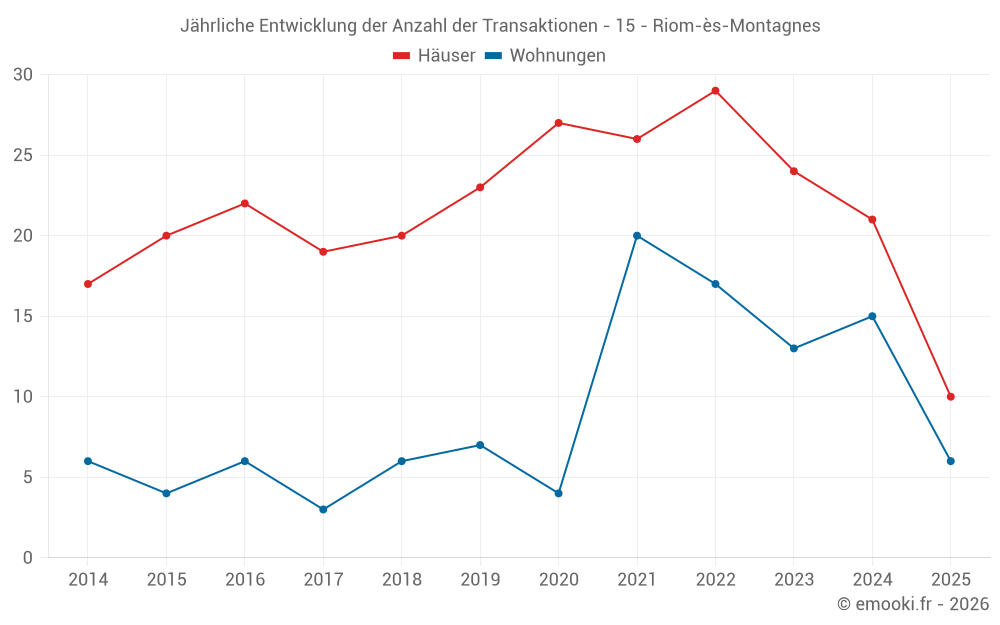 Der Durchschnittspreis auf den 17 Wohnungstransaktionen der letzten 12 Monate in der Gemeinde Riom-ès-Montagnes betrug 862 € pro Quadratmeter für einen mittleren Immobilienwert von 42 000 €. Über diesen Zeitraum hinweg lagen 60% der Transaktionen zwischen 653 und 1 165 € pro Quadratmeter (vom 2. bis zum 8. Dezil).