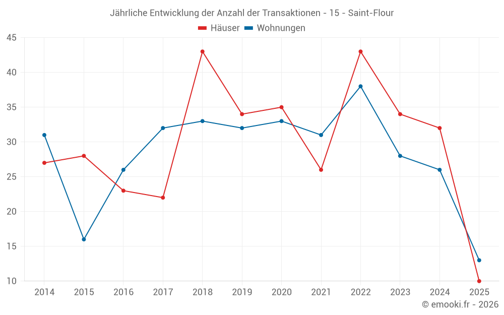 Der Durchschnittspreis auf den 30 Wohnungstransaktionen der letzten 12 Monate in der Gemeinde Saint-Flour betrug 1 138 € pro Quadratmeter für einen mittleren Immobilienwert von 88 750 €. Über diesen Zeitraum hinweg lagen 60% der Transaktionen zwischen 795 und 1 611 € pro Quadratmeter (vom 2. bis zum 8. Dezil).