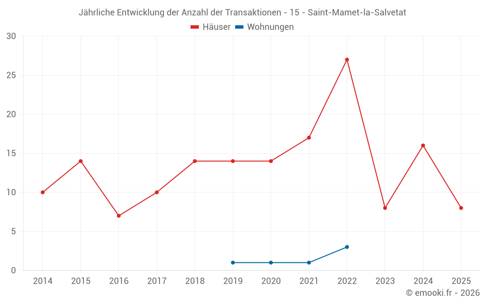Der Durchschnittspreis auf den 17 Hausgeschäften der letzten 12 Monate in der Gemeinde Saint-Mamet-la-Salvetat betrug 1 386 € pro Quadratmeter für einen mittleren Immobilienwert von 133 840 €. Über diesen Zeitraum hinweg lagen 60% der Transaktionen zwischen 1 085 und 1 937 € pro Quadratmeter (vom 2. bis zum 8. Dezil).