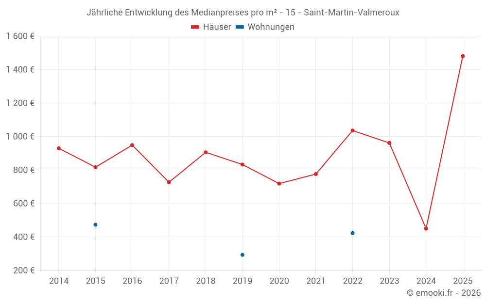 Der Durchschnittspreis auf den 18 Hausgeschäften der letzten 24 Monate in der Gemeinde Saint-Martin-Valmeroux betrug 1 013 € pro Quadratmeter für einen mittleren Immobilienwert von 73 925 €. Über diesen Zeitraum hinweg lagen 60% der Transaktionen zwischen 510 und 1 449 € pro Quadratmeter (vom 2. bis zum 8. Dezil).