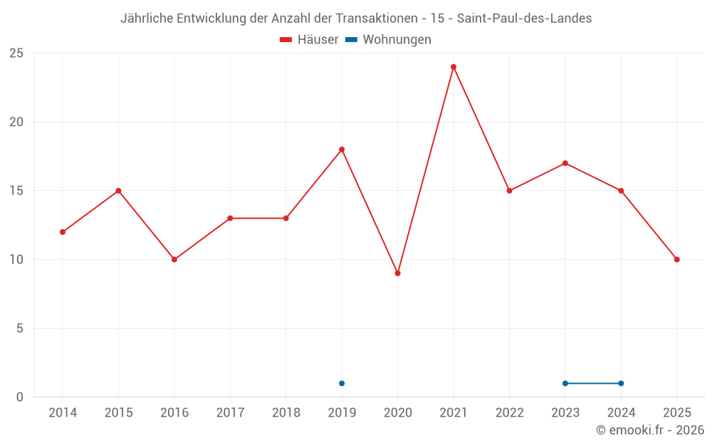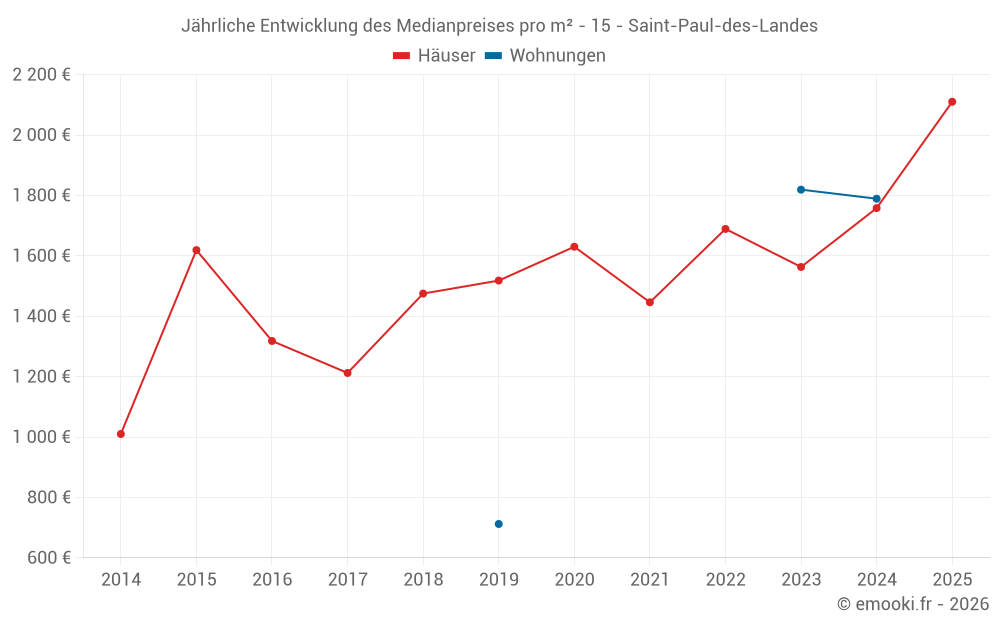 Der Durchschnittspreis auf den 18 Hausgeschäften der letzten 12 Monate in der Gemeinde Saint-Paul-des-Landes betrug 2 102 € pro Quadratmeter für einen mittleren Immobilienwert von 165 030 €. Über diesen Zeitraum hinweg lagen 60% der Transaktionen zwischen 1 332 und 2 192 € pro Quadratmeter (vom 2. bis zum 8. Dezil).