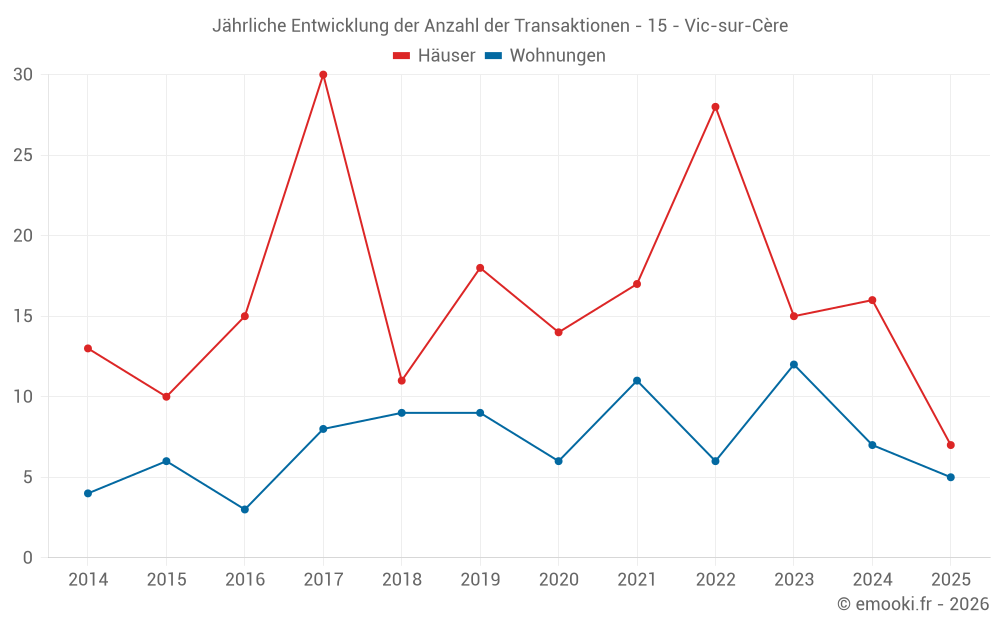 Der Durchschnittspreis auf den 33 Hausgeschäften der letzten 24 Monate in der Gemeinde Vic-sur-Cère betrug 1 104 € pro Quadratmeter für einen mittleren Immobilienwert von 104 500 €. Über diesen Zeitraum hinweg lagen 60% der Transaktionen zwischen 644 und 1 712 € pro Quadratmeter (vom 2. bis zum 8. Dezil).