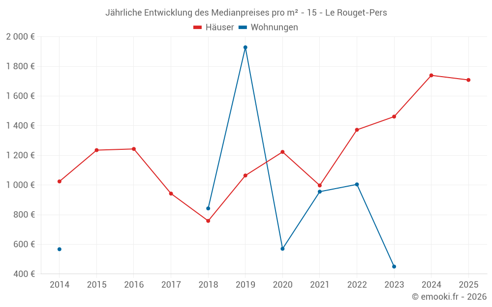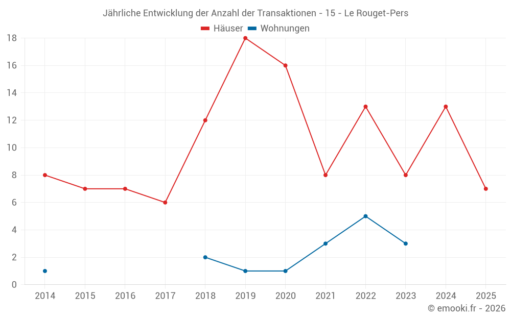 Der Durchschnittspreis auf den 25 Hausgeschäften der letzten 24 Monate in der Gemeinde Le Rouget-Pers betrug 1 566 € pro Quadratmeter für einen mittleren Immobilienwert von 120 550 €. Über diesen Zeitraum hinweg lagen 60% der Transaktionen zwischen 850 und 1 930 € pro Quadratmeter (vom 2. bis zum 8. Dezil).