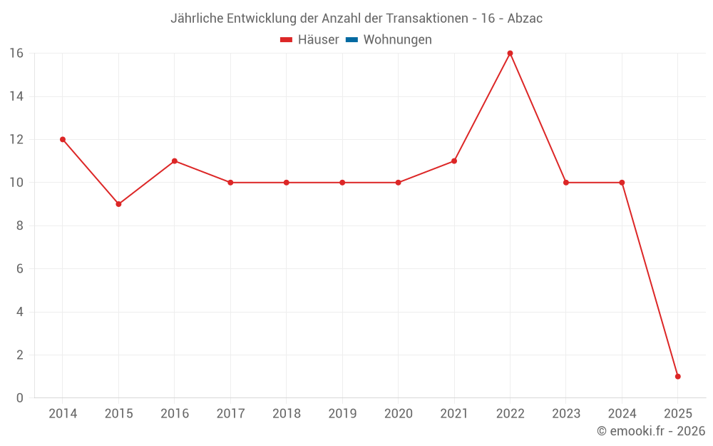Der Durchschnittspreis auf den 20 Hausgeschäften der letzten 24 Monate in der Gemeinde Abzac betrug 710 € pro Quadratmeter für einen mittleren Immobilienwert von 74 135 €. Über diesen Zeitraum hinweg lagen 60% der Transaktionen zwischen 420 und 1 161 € pro Quadratmeter (vom 2. bis zum 8. Dezil).
