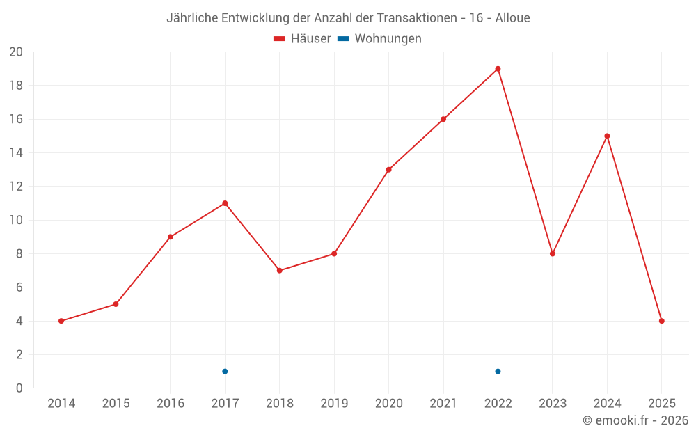 Der Durchschnittspreis auf den 16 Hausgeschäften der letzten 12 Monate in der Gemeinde Alloue betrug 857 € pro Quadratmeter für einen mittleren Immobilienwert von 88 500 €. Über diesen Zeitraum hinweg lagen 60% der Transaktionen zwischen 521 und 1 089 € pro Quadratmeter (vom 2. bis zum 8. Dezil).