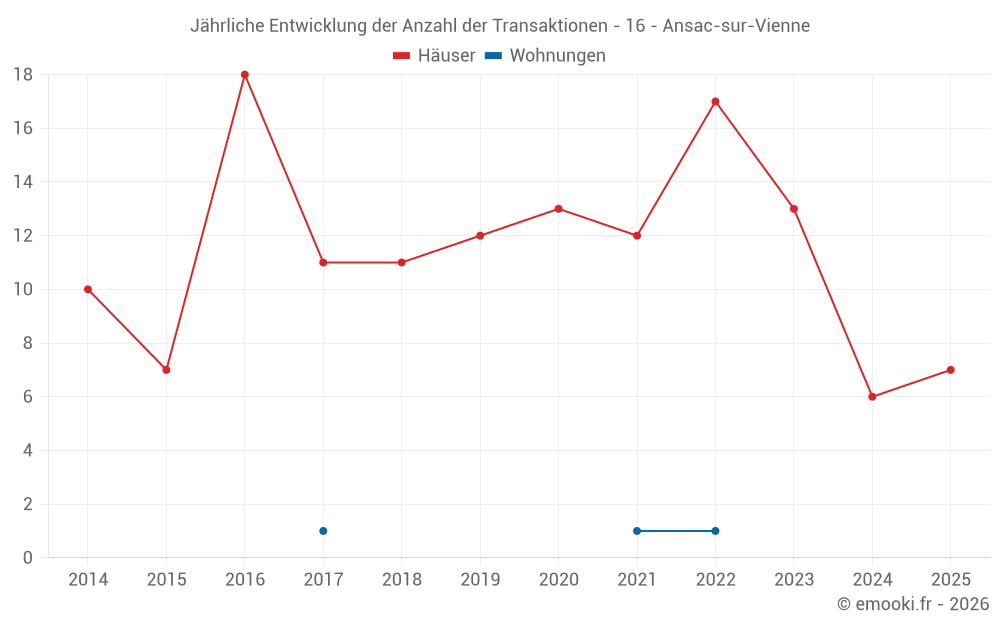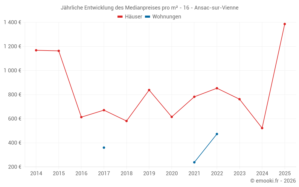 Der Durchschnittspreis auf den 19 Hausgeschäften der letzten 24 Monate in der Gemeinde Ansac-sur-Vienne betrug 907 € pro Quadratmeter für einen mittleren Immobilienwert von 108 850 €. Über diesen Zeitraum hinweg lagen 60% der Transaktionen zwischen 517 und 1 439 € pro Quadratmeter (vom 2. bis zum 8. Dezil).