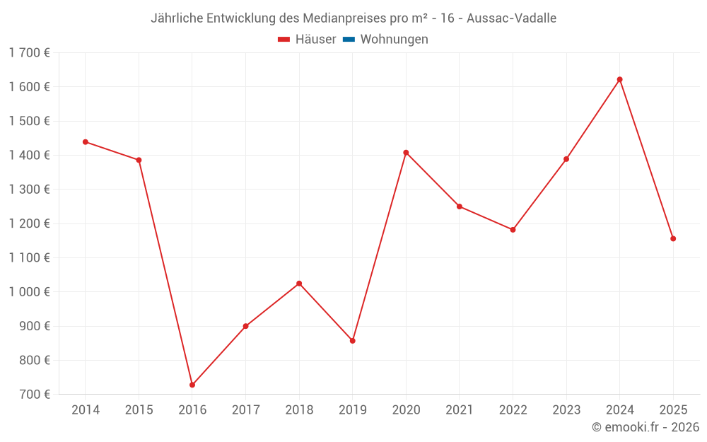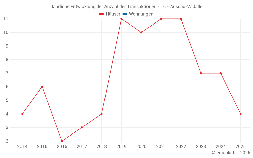 Der Durchschnittspreis auf den 15 Hausgeschäften der letzten 24 Monate in der Gemeinde Aussac-Vadalle betrug 1 289 € pro Quadratmeter für einen mittleren Immobilienwert von 146 000 €. Über diesen Zeitraum hinweg lagen 60% der Transaktionen zwischen 989 und 1 724 € pro Quadratmeter (vom 2. bis zum 8. Dezil).