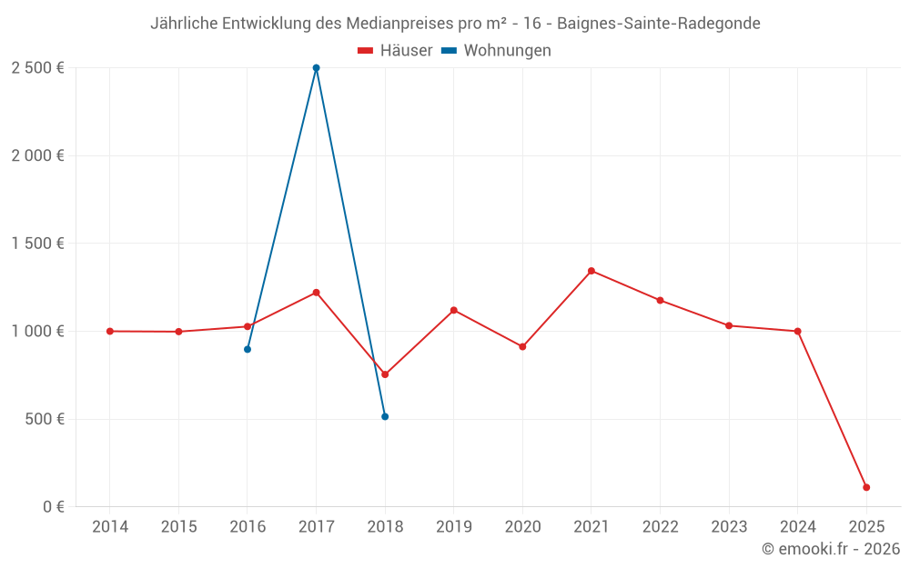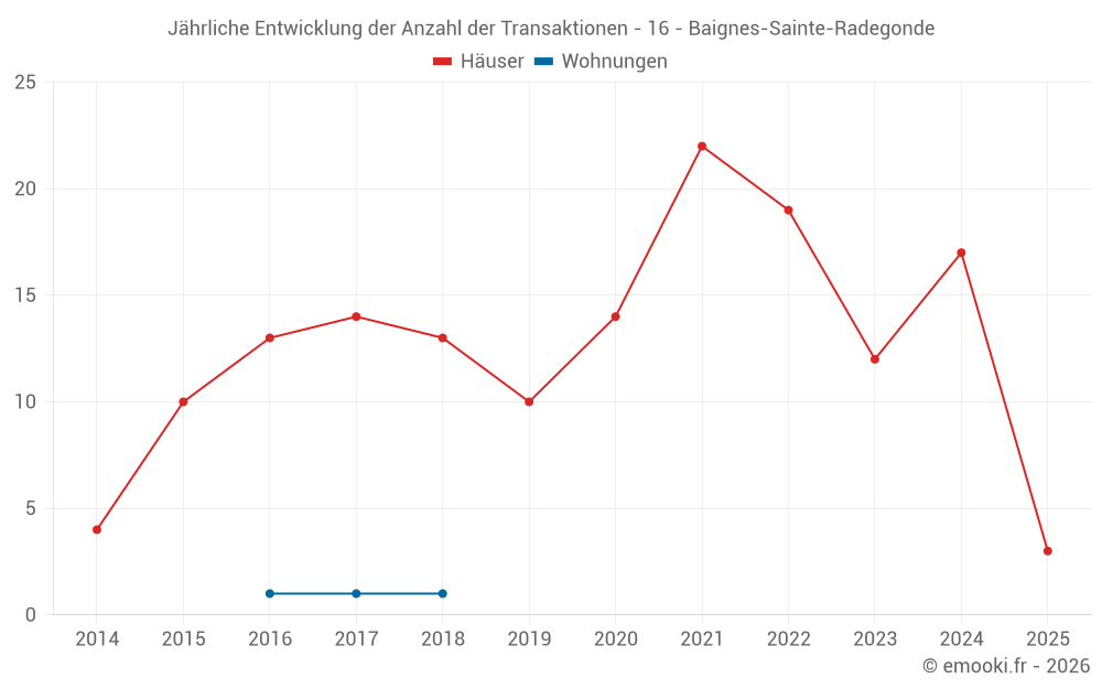 Der Durchschnittspreis auf den 27 Hausgeschäften der letzten 24 Monate in der Gemeinde Baignes-Sainte-Radegonde betrug 833 € pro Quadratmeter für einen mittleren Immobilienwert von 108 426 €. Über diesen Zeitraum hinweg lagen 60% der Transaktionen zwischen 442 und 1 485 € pro Quadratmeter (vom 2. bis zum 8. Dezil).