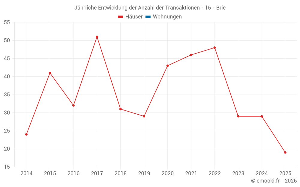 Der Durchschnittspreis auf den 19 Hausgeschäften der letzten 6 Monate in der Gemeinde Brie betrug 1 670 € pro Quadratmeter für einen mittleren Immobilienwert von 171 000 €. Über diesen Zeitraum hinweg lagen 60% der Transaktionen zwischen 1 146 und 2 011 € pro Quadratmeter (vom 2. bis zum 8. Dezil).