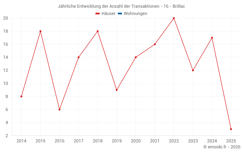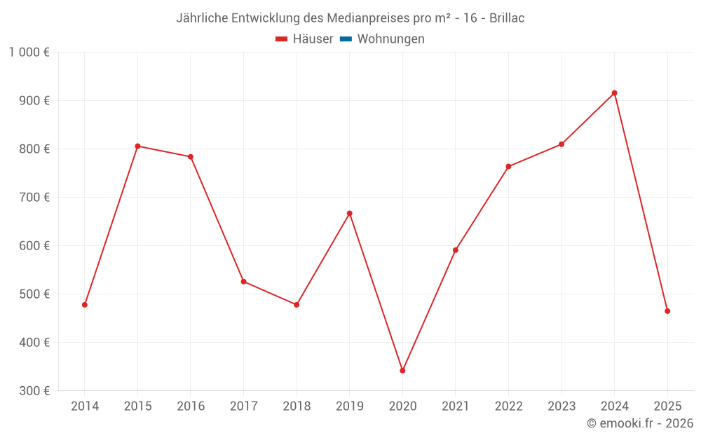 Der Durchschnittspreis auf den 26 Hausgeschäften der letzten 24 Monate in der Gemeinde Brillac betrug 872 € pro Quadratmeter für einen mittleren Immobilienwert von 79 700 €. Über diesen Zeitraum hinweg lagen 60% der Transaktionen zwischen 435 und 1 253 € pro Quadratmeter (vom 2. bis zum 8. Dezil).