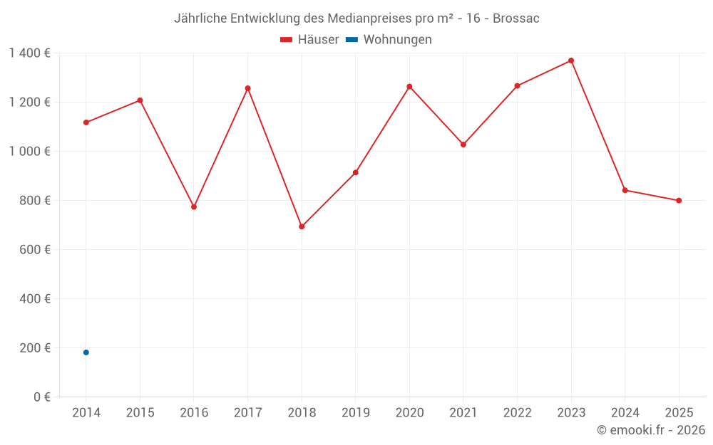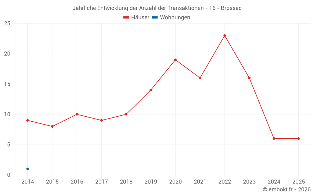 Der Durchschnittspreis auf den 19 Hausgeschäften der letzten 24 Monate in der Gemeinde Brossac betrug 907 € pro Quadratmeter für einen mittleren Immobilienwert von 90 000 €. Über diesen Zeitraum hinweg lagen 60% der Transaktionen zwischen 523 und 1 621 € pro Quadratmeter (vom 2. bis zum 8. Dezil).