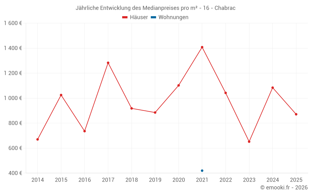 Der Durchschnittspreis auf den 19 Hausgeschäften der letzten 24 Monate in der Gemeinde Chabrac betrug 1 000 € pro Quadratmeter für einen mittleren Immobilienwert von 80 000 €. Über diesen Zeitraum hinweg lagen 60% der Transaktionen zwischen 460 und 1 477 € pro Quadratmeter (vom 2. bis zum 8. Dezil).