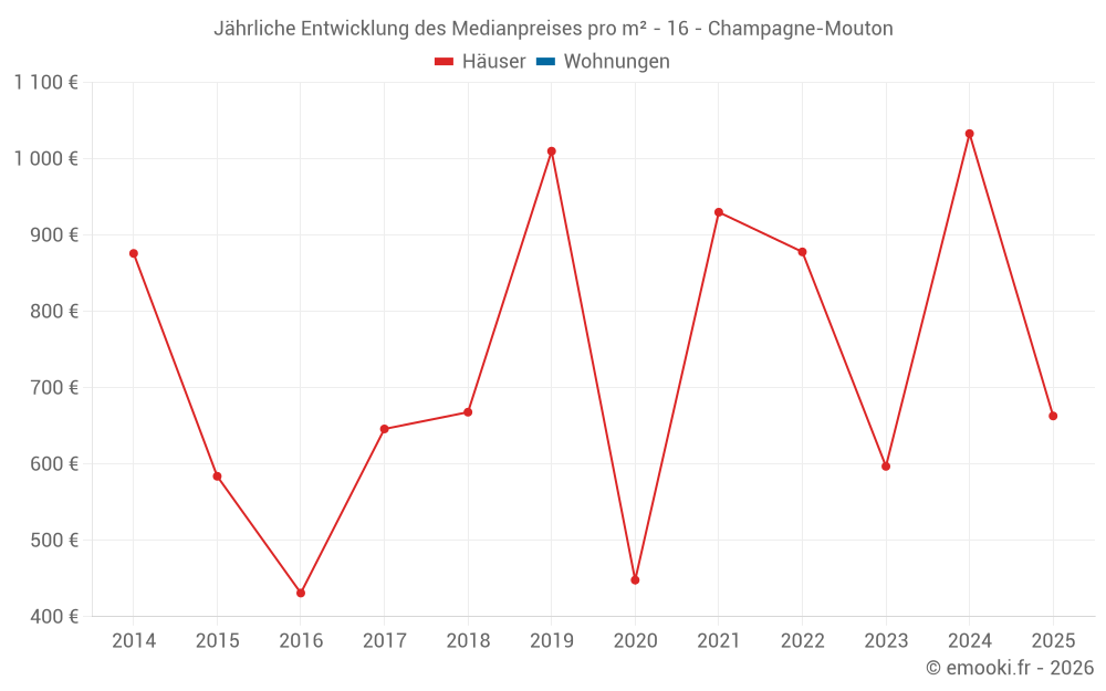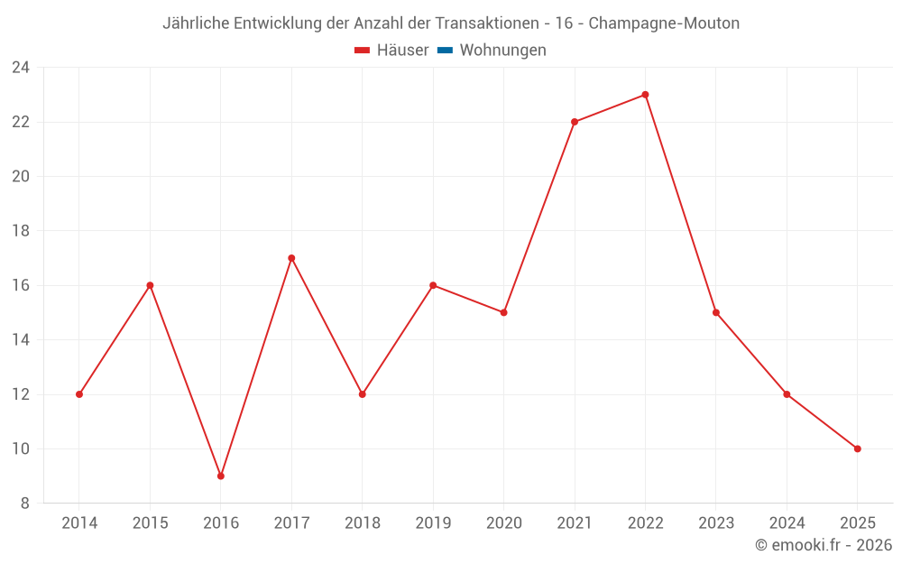 Der Durchschnittspreis auf den 17 Hausgeschäften der letzten 12 Monate in der Gemeinde Champagne-Mouton betrug 848 € pro Quadratmeter für einen mittleren Immobilienwert von 80 000 €. Über diesen Zeitraum hinweg lagen 60% der Transaktionen zwischen 557 und 1 226 € pro Quadratmeter (vom 2. bis zum 8. Dezil).