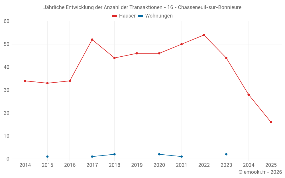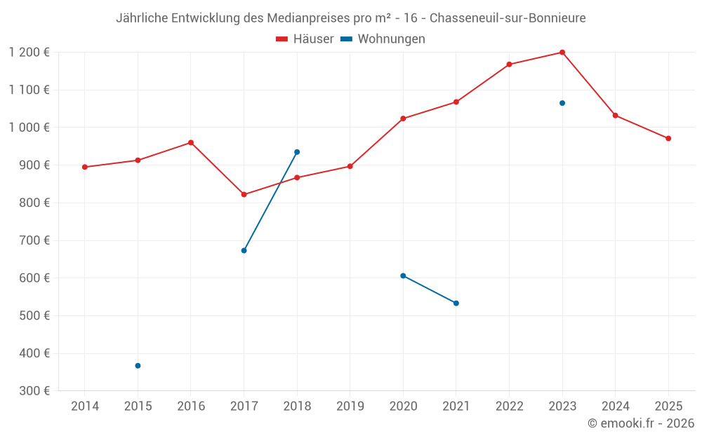 Der Durchschnittspreis auf den 31 Hausgeschäften der letzten 12 Monate in der Gemeinde Chasseneuil-sur-Bonnieure betrug 984 € pro Quadratmeter für einen mittleren Immobilienwert von 112 750 €. Über diesen Zeitraum hinweg lagen 60% der Transaktionen zwischen 714 und 1 505 € pro Quadratmeter (vom 2. bis zum 8. Dezil).