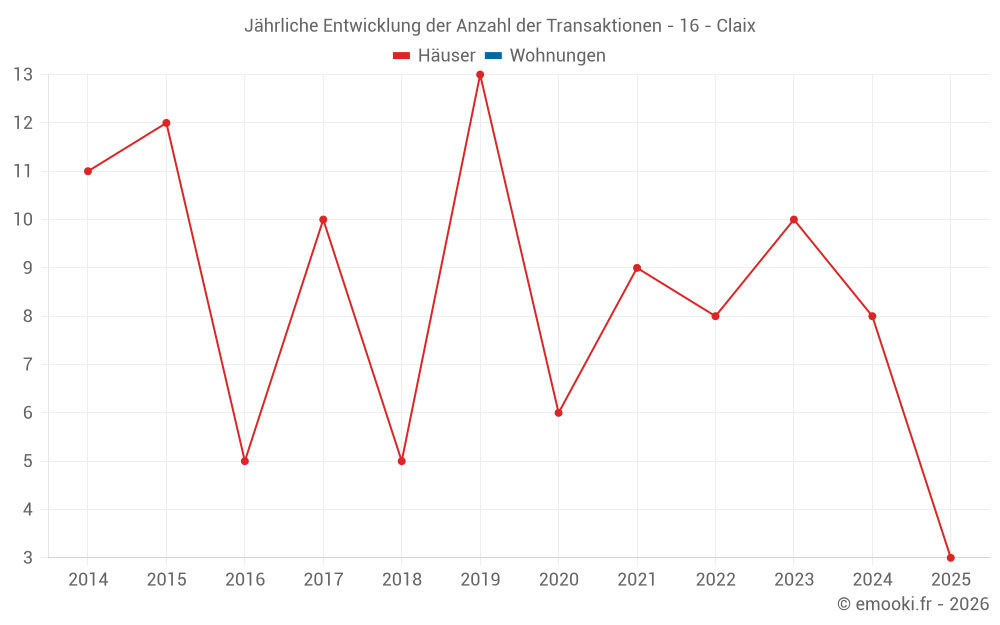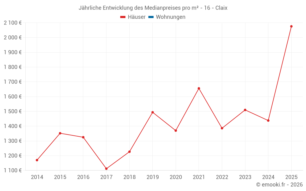 Der Durchschnittspreis auf den 17 Hausgeschäften der letzten 24 Monate in der Gemeinde Claix betrug 1 463 € pro Quadratmeter für einen mittleren Immobilienwert von 182 000 €. Über diesen Zeitraum hinweg lagen 60% der Transaktionen zwischen 1 163 und 2 030 € pro Quadratmeter (vom 2. bis zum 8. Dezil).