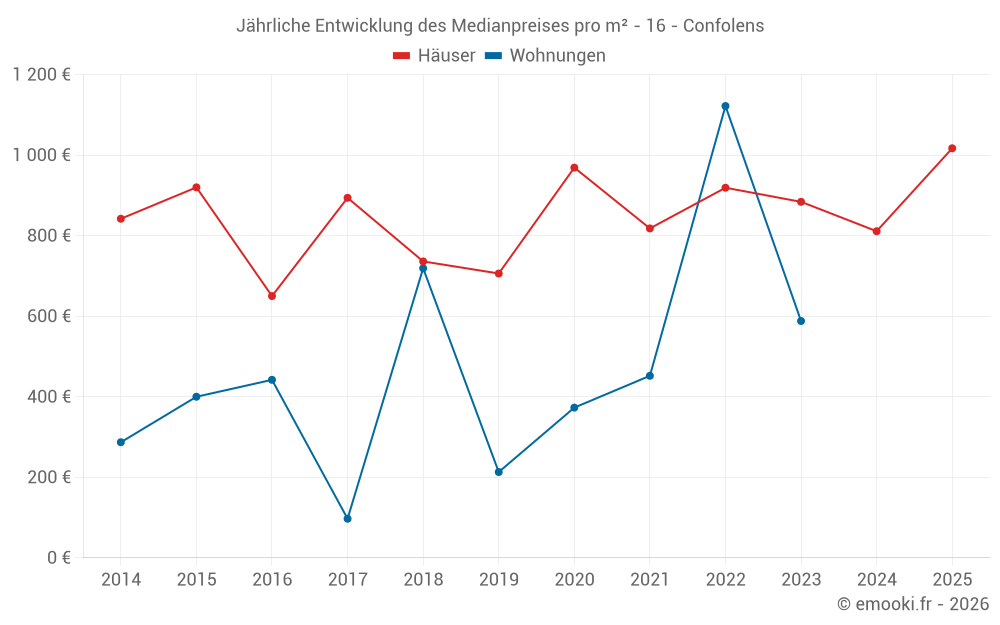 Der Durchschnittspreis auf den 22 Hausgeschäften der letzten 6 Monate in der Gemeinde Confolens betrug 1 017 € pro Quadratmeter für einen mittleren Immobilienwert von 76 000 €. Über diesen Zeitraum hinweg lagen 60% der Transaktionen zwischen 538 und 1 398 € pro Quadratmeter (vom 2. bis zum 8. Dezil).
