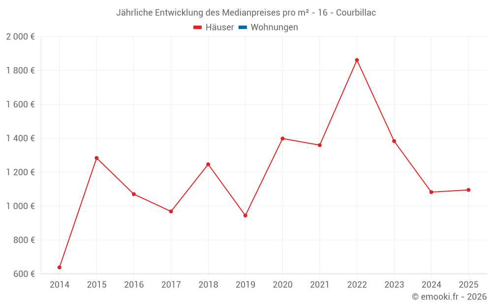 Der Durchschnittspreis auf den 18 Hausgeschäften der letzten 24 Monate in der Gemeinde Courbillac betrug 1 216 € pro Quadratmeter für einen mittleren Immobilienwert von 132 500 €. Über diesen Zeitraum hinweg lagen 60% der Transaktionen zwischen 922 und 1 859 € pro Quadratmeter (vom 2. bis zum 8. Dezil).