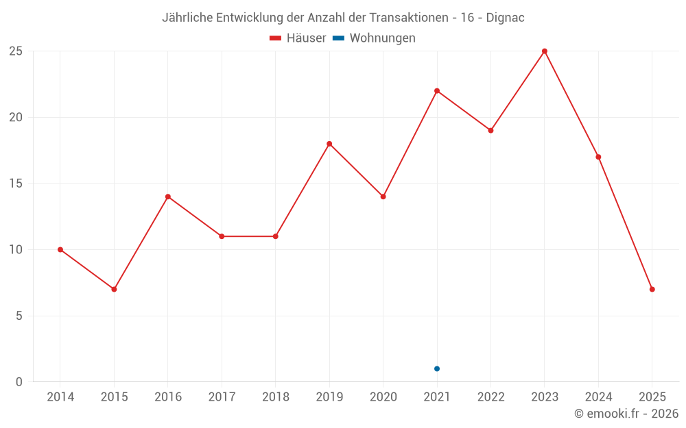 Der Durchschnittspreis auf den 16 Hausgeschäften der letzten 12 Monate in der Gemeinde Dignac betrug 1 094 € pro Quadratmeter für einen mittleren Immobilienwert von 121 996 €. Über diesen Zeitraum hinweg lagen 60% der Transaktionen zwischen 435 und 1 684 € pro Quadratmeter (vom 2. bis zum 8. Dezil).