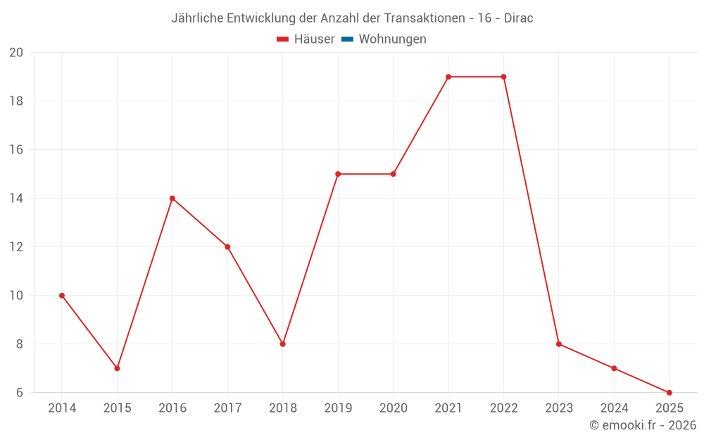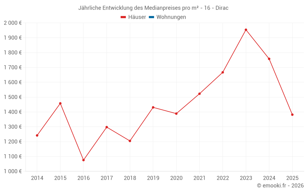 Der Durchschnittspreis auf den 16 Hausgeschäften der letzten 24 Monate in der Gemeinde Dirac betrug 1 793 € pro Quadratmeter für einen mittleren Immobilienwert von 189 500 €. Über diesen Zeitraum hinweg lagen 60% der Transaktionen zwischen 1 055 und 2 025 € pro Quadratmeter (vom 2. bis zum 8. Dezil).
