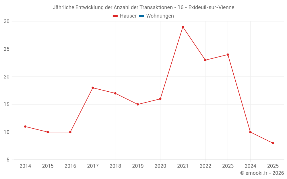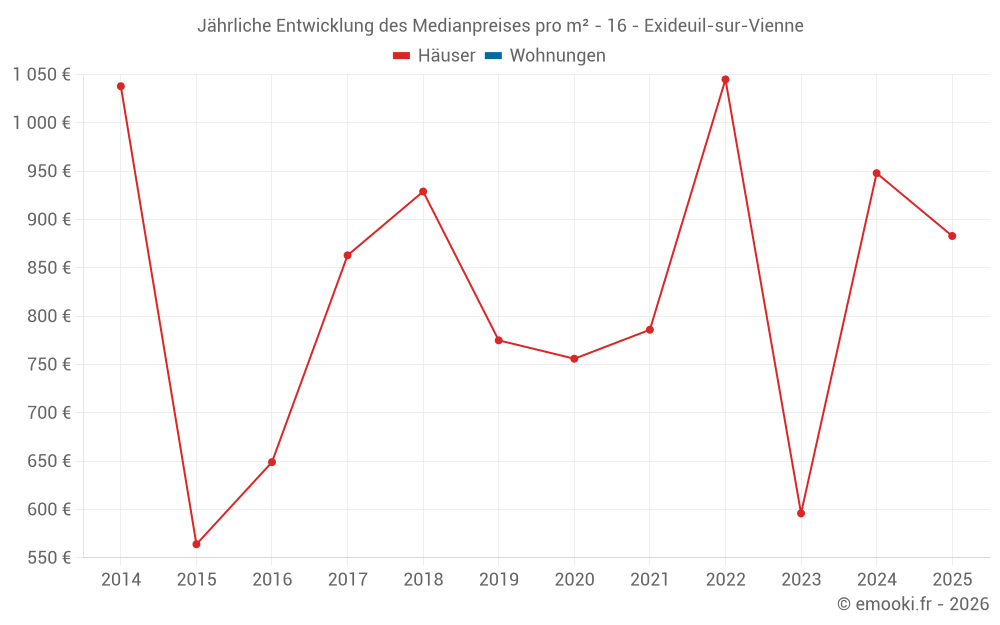 Der Durchschnittspreis auf den 26 Hausgeschäften der letzten 24 Monate in der Gemeinde Exideuil-sur-Vienne betrug 1 036 € pro Quadratmeter für einen mittleren Immobilienwert von 100 584 €. Über diesen Zeitraum hinweg lagen 60% der Transaktionen zwischen 294 und 1 365 € pro Quadratmeter (vom 2. bis zum 8. Dezil).