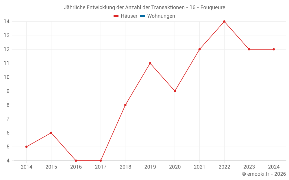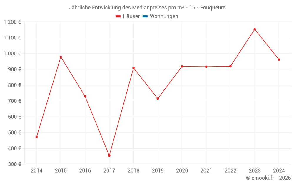 Der Durchschnittspreis auf den 17 Hausgeschäften der letzten 24 Monate in der Gemeinde Fouqueure betrug 1 160 € pro Quadratmeter für einen mittleren Immobilienwert von 134 000 €. Über diesen Zeitraum hinweg lagen 60% der Transaktionen zwischen 663 und 1 349 € pro Quadratmeter (vom 2. bis zum 8. Dezil).