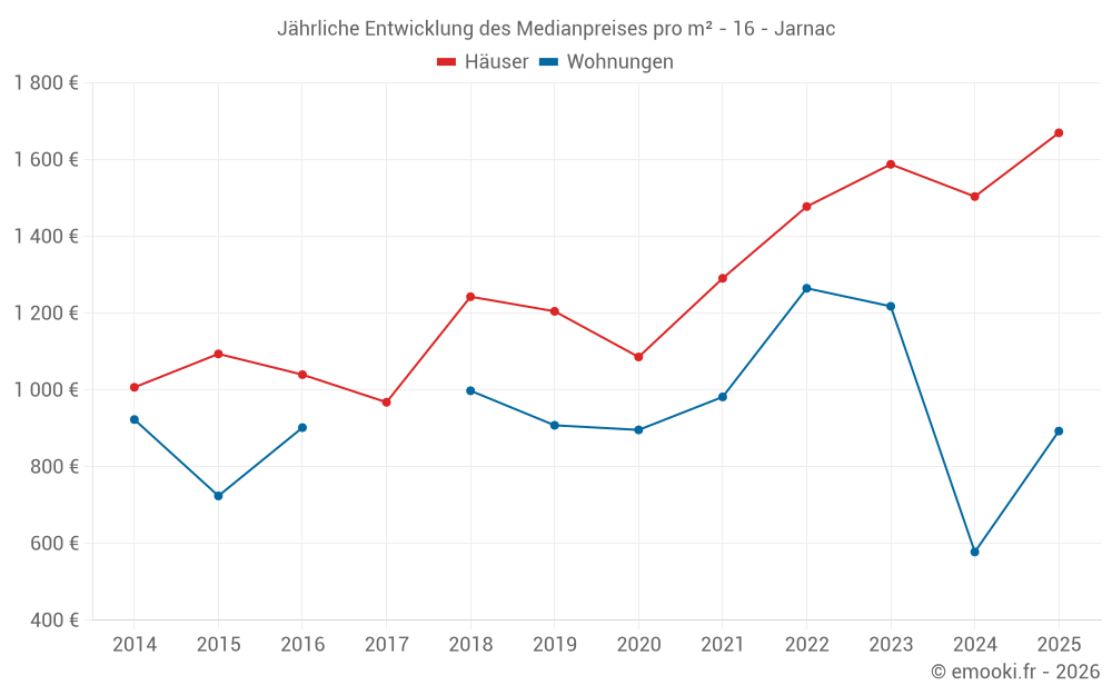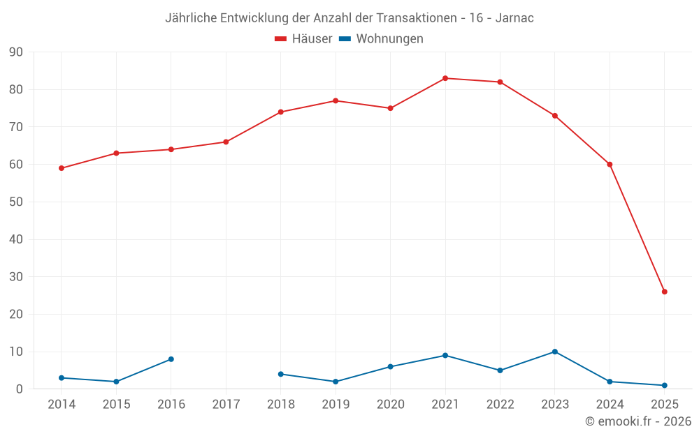 Der Durchschnittspreis auf den 22 Hausgeschäften der letzten 3 Monate in der Gemeinde Jarnac betrug 1 350 € pro Quadratmeter für einen mittleren Immobilienwert von 137 500 €. Über diesen Zeitraum hinweg lagen 60% der Transaktionen zwischen 1 084 und 2 038 € pro Quadratmeter (vom 2. bis zum 8. Dezil).