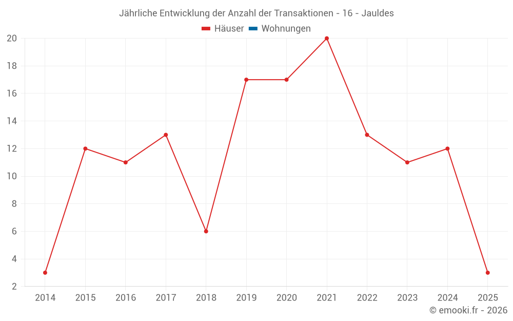 Der Durchschnittspreis auf den 22 Hausgeschäften der letzten 24 Monate in der Gemeinde Jauldes betrug 1 340 € pro Quadratmeter für einen mittleren Immobilienwert von 167 675 €. Über diesen Zeitraum hinweg lagen 60% der Transaktionen zwischen 1 133 und 1 720 € pro Quadratmeter (vom 2. bis zum 8. Dezil).