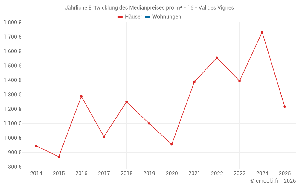 Der Durchschnittspreis auf den 14 Hausgeschäften der letzten 24 Monate in der Gemeinde Val des Vignes betrug 1 760 € pro Quadratmeter für einen mittleren Immobilienwert von 149 750 €. Über diesen Zeitraum hinweg lagen 60% der Transaktionen zwischen 1 155 und 2 027 € pro Quadratmeter (vom 2. bis zum 8. Dezil).