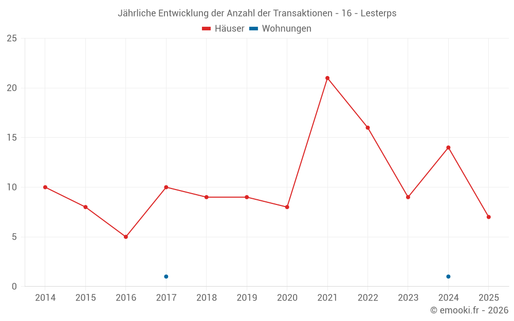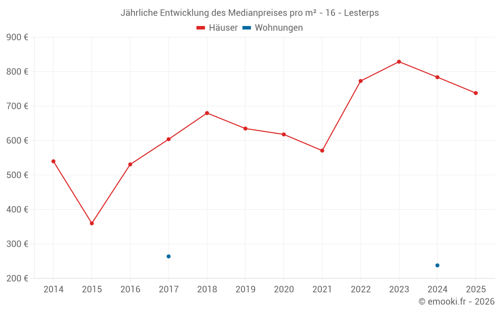 Der Durchschnittspreis auf den 26 Hausgeschäften der letzten 24 Monate in der Gemeinde Lesterps betrug 784 € pro Quadratmeter für einen mittleren Immobilienwert von 67 950 €. Über diesen Zeitraum hinweg lagen 60% der Transaktionen zwischen 300 und 1 878 € pro Quadratmeter (vom 2. bis zum 8. Dezil).
